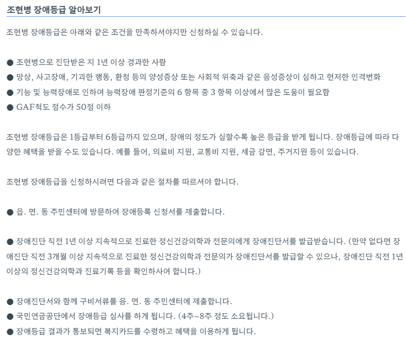조현병 장애등급 판정기준은 어떻게 되나요?